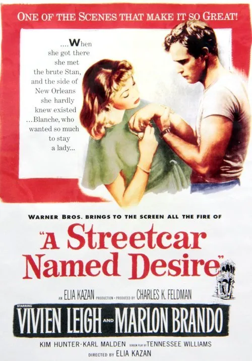 대표적인 작품으로는 **《욕망이라는 이름의 전차》(A Streetcar Named Desire, 1951)**가 있습니다. 이 영화는 테네시 윌리엄스의 희곡을 원작으로 하여, 인간의 욕망, 좌절, 사회적 계급과 성적 억압을 진한 감정선으로 그려냅니다. 특히 말론 브란도의 거칠고 섬세한 연기는 헐리우드 배우 연기법의 전환점을 만들어냈습니다. 감정의 억제를 중시하던 기존 연기에서 벗어나, 리얼리즘 연기를 영화 속에 도입함으로써 이후 배우들의 연기 스타일에도 큰 영향을 주었습니다.
